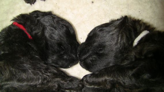 Brownie und die Kleinen Hier sieht man schön den Welpenschutz. Darunter können sich die Kleinen verstecken, damit sie nicht gedrückt werden, wenn Brownie sich umlegt. Links ist BELLAROSA, in der Mitte BELAGO und rechts BAVIA Die kleinen Bouviers werden bald zwei Wochen alt. Das Säugen bei der Mutter…