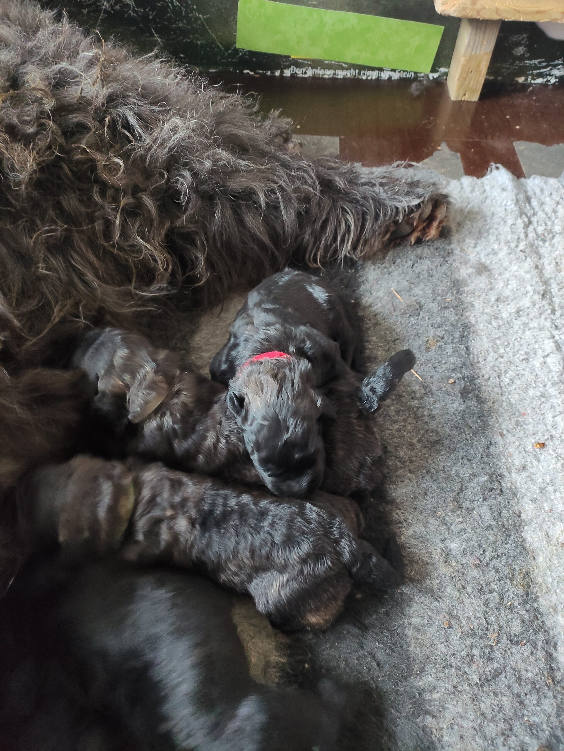 Die Kleinen wirken nie wirklich hungrig. Wenn Askanti in die Wurfbox geht und noch ein oder zwei am Schlafen sind, dann entsteht keine Hektik. Irgendwann werden die beiden dann auch wach und ab geht´s an die Milchbar, zügig zwar, aber nicht panisch. Es ist immer genug von allem da! 5 Hunde ist eben eine Zahl, mit der Askanti super klarkommt. Sie bekommt weiter das Welpenfutter, aber jetzt geben wir schon einen Teil ihres geliebten Belcando Ocean dazu. Das ist kalorisch etwas geringer. Sie soll ja jetzt nicht zunehmen!