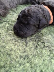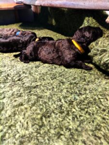 Der grüne Rüde hat heute morgen 665 Gramm und liegt damit im Mittelfeld der Gewichte. Die orange Hündin zeigt sich mit ihrem wunderschönen, beeindruckendem Kopf und die gelbe Hündin gibt sich super entspannt.